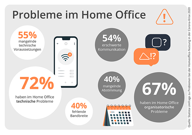Laut Statista haben 72 Prozent der Befragten im Home Office mit technischen und 67 Prozent mit organisatorischen Problemen zu kämpfen. Mehr als der Hälfte (55 Prozent) mangelt es an technischer Ausstattung. Das sind zwar hauptsächlich Probleme, die die Organisation betreffen, diese können sich letztlich aber auch im Stresslevel der Arbeitnehmer:innen widerspiegeln.
